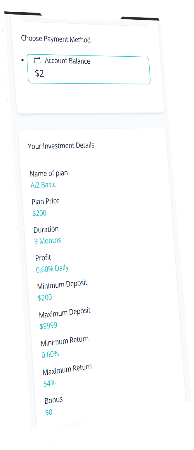 Sign upWith your account fully set up and your crypto wallet funded, you're ready to make your first deposit and officially begin your investment journey with ai2capital Limited. Navigate to the 'Investment' section of our website. Here, you will see our exclusive investment plan that offers a 0.60% -1.50% daily return for 90 business days.